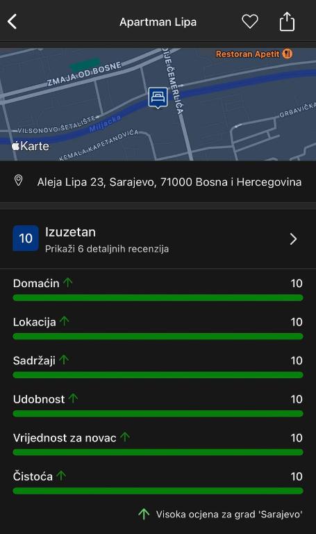 The distance between Apartman Lipa New and Sarajevo International Airport is approximately 6 km.